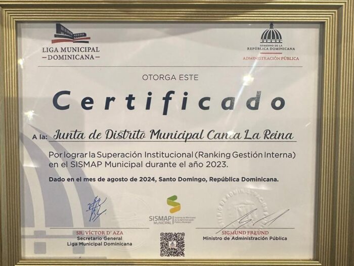 La Junta Distrital de Canca La Reina ha sido reconocida por la Liga Municipal Dominicana (LMD) y el Ministerio de Administración Pública (MAP) por nuestra destacada superación institucional en el ranking de gestión interna.