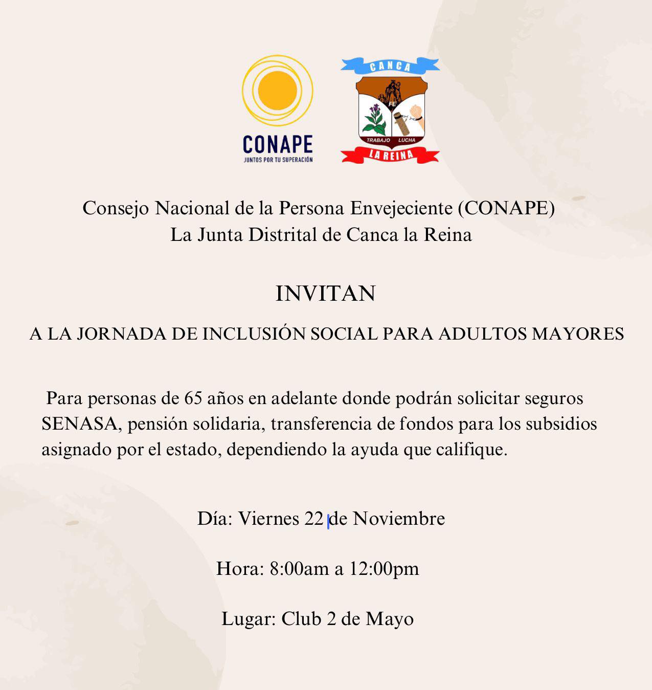 La Junta Distrital de Canca La Reina junto al Consejo Nacional de la Persona envejeciente (CONAPE) invita a todas las personas que su edad ascienda los 65 años para que participe de la Jornada de Inclusión Social para personas mayores, aquí podrán solicitar seguros de salud, pensiones solidarias, transferencia de fondos de ayudas sociales etc.
