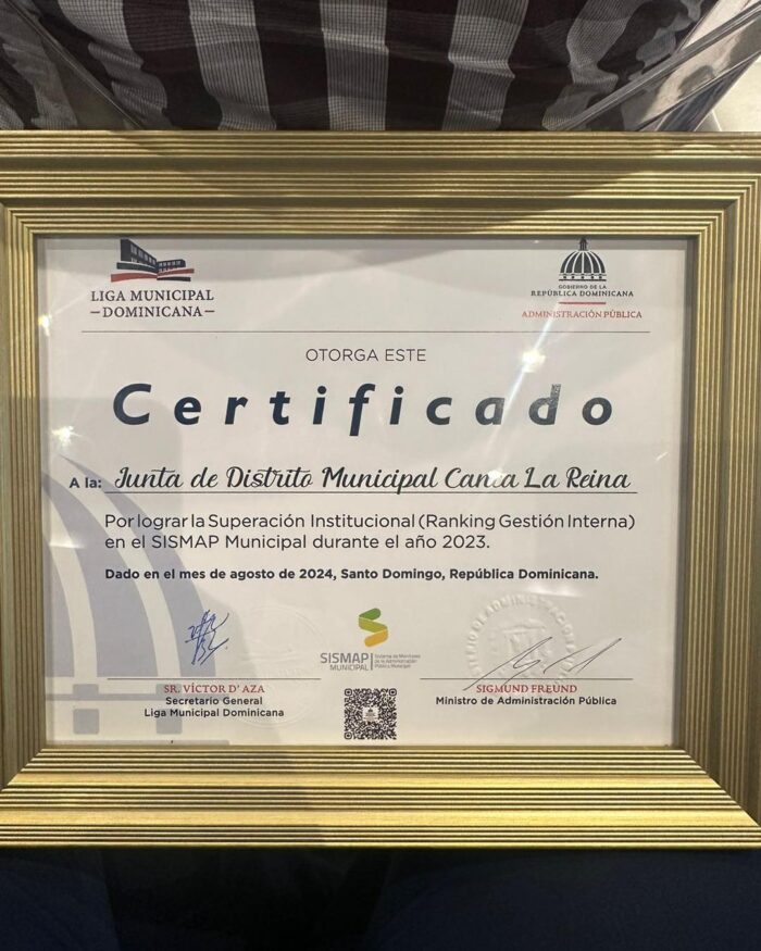 Hoy, nos llena de orgullo recibir este importante reconocimiento, siendo una de las pocas Juntas Distritales en cumplir al 100% con las reglas de transparencia e institucionalidad establecidas por el SISMAP.