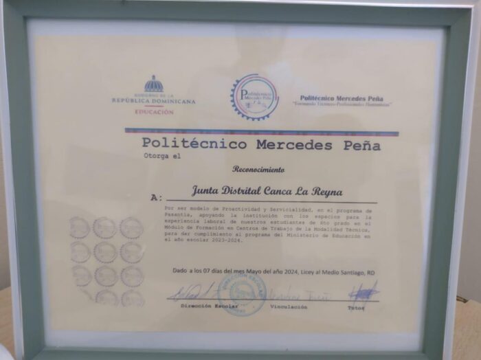 El Politécnico Mercedes Peña, valora enormemente el modelo de proactividad y servicialidad de nuestra Junta Distrital, agradece el apoyo brindado a su programa de pasantías y proporcionar espacios para la experiencia laboral de sus estudiantes de 6to grado en el Módulo de Formación en Centros de Trabajo de la Modalidad Técnica.