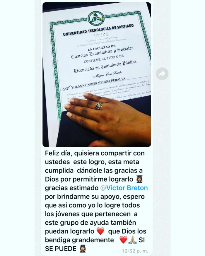 Nos llena de orgullo y alegría recibir el mensaje de una joven graduada, expresando su gratitud hacia el director distrital, el Lic. Víctor Breton, por la invaluable ayuda brindada.